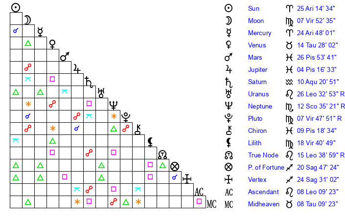 | Moon | 7 Virgo 49 | 25 Scorpio 10 | 21 Sagittarius 21 |