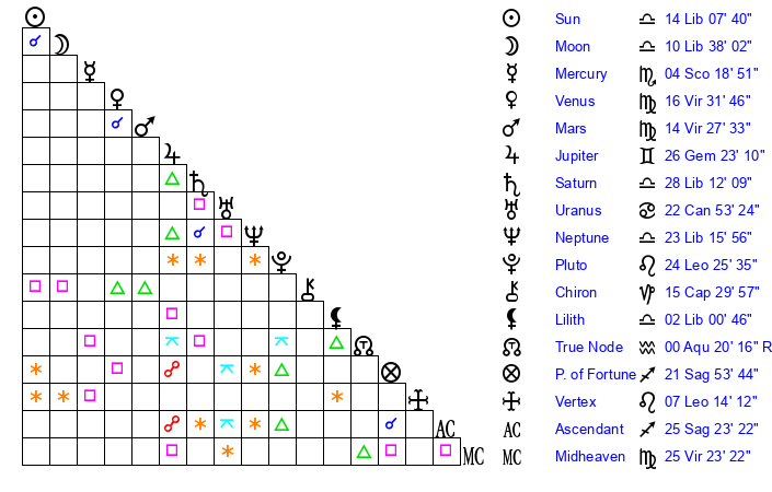 | Neptune | 23 Libra 16 | 0 Aries 21 | 25 Libra 37 |