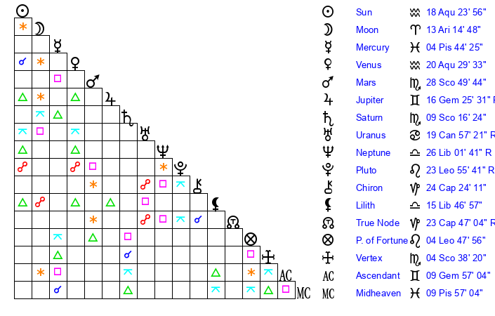 | Moon | 13 Aries 9 | 19 Gemini 48 | 15 Scorpio 6 |