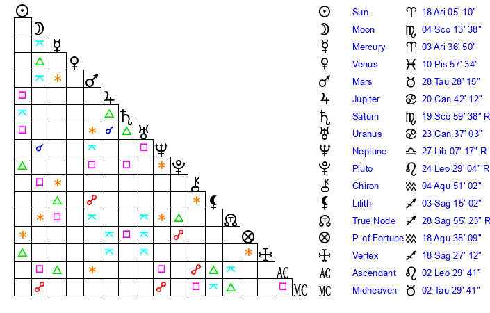 | Saturn | 20 Scorpio 31 | 25 Pisces 19 | 15 Scorpio 49 |