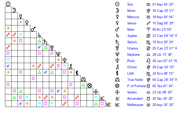 | Saturn | 20 Scorpio 27 | 16 Pisces 23 | 20 Scorpio 50 |