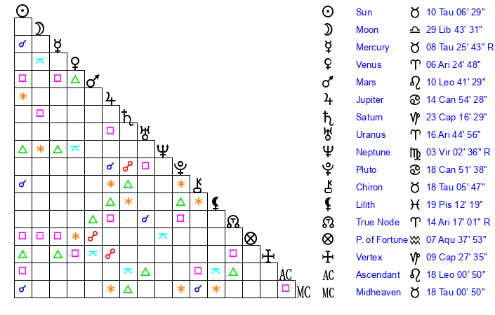 | Sun | 10 Taurus 6 | 11 Taurus 20 | 10 Leo 8 |