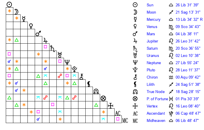 | Sun | 26 Libra 31 | 27 Libra 33 | 7 Capricorn 12 |