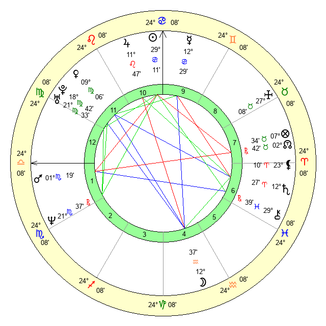 | Sun | 29 Cancer 12 | 0 Leo 8 | 25 Virgo 5 |