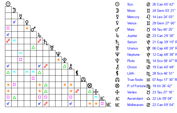 | Neptune | 12 Capricorn 48 | 2 Aries 6 | 12 Capricorn 2 |