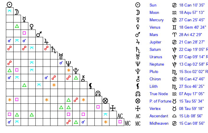 | Moon | 19 Aquarius 2 | 16 Capricorn 59 | 5 Gemini 24 |