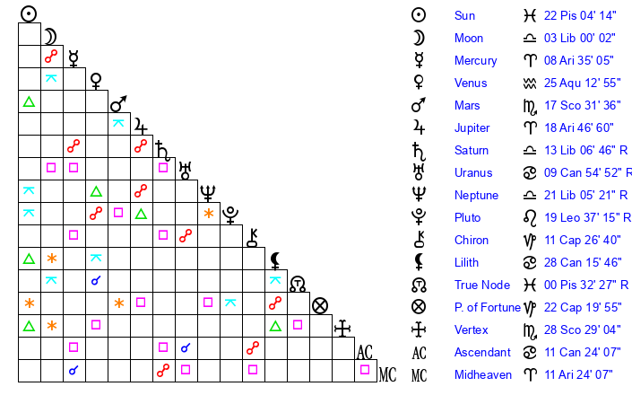 | Neptune | 21 Libra 5 | 29 Pisces 19 | 19 Libra 16 |