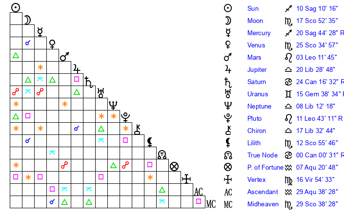 | Venus | 25 Scorpio 35 | 2 Sagittarius 21 | 6 Pisces 6 |