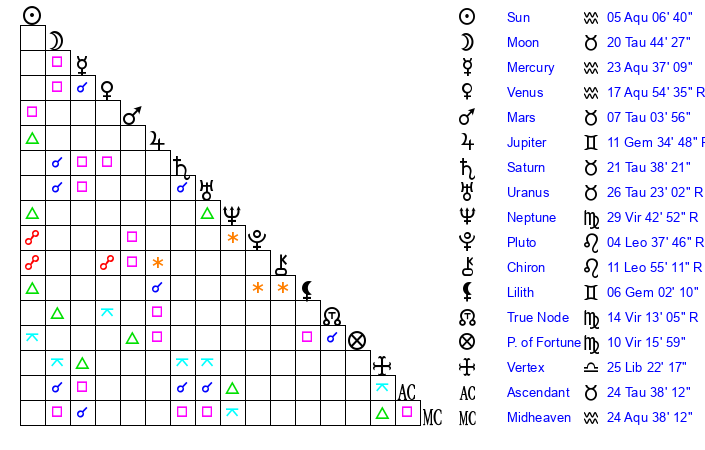 | Moon | 20 Taurus 43 | 18 Sagittarius 48 | 2 Gemini 37 |