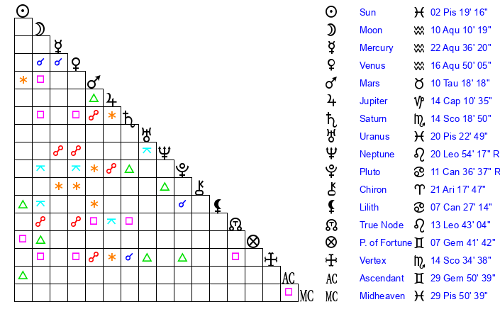 | Sun | 2 Pisces 19 | 3 Pisces 4 | 10 Gemini 25 |
