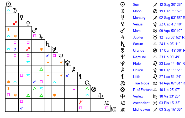 | Sun | 12 Sagittarius 30 | 12 Sagittarius 48 | 26 Aquarius 44 |