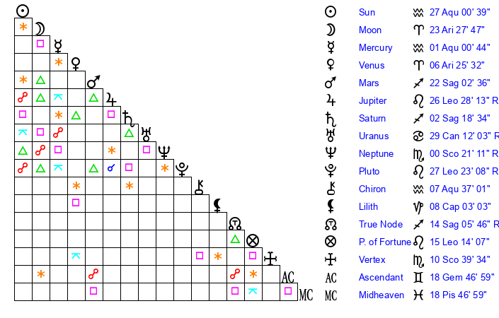 | Sun | 27 Aquarius 0 | 28 Aquarius 16 | 5 Taurus 27 |