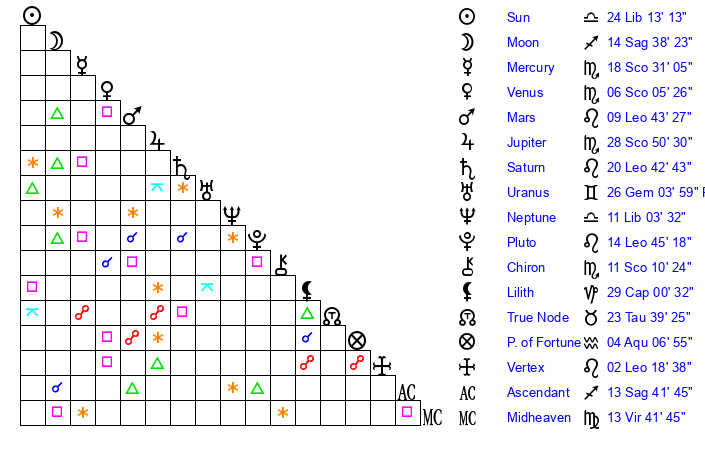 Sun | 24 Libra 13 | 25 Libra 34 | 11 Capricorn 59 |