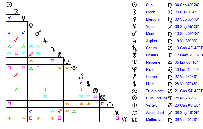 | Neptune | 5 Libra 7 | 29 Pisces 51 | 6 Libra 25 |