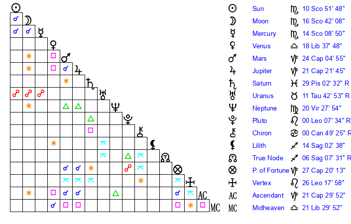 | Sun | 10 Scorpio 51 | 11 Scorpio 31 | 10 Aquarius 10 |