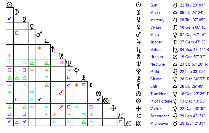 | Moon | 6 Libra 21 | 4 Sagittarius 13 | 9 Taurus 27 |
