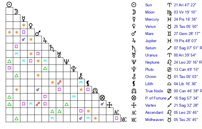 | Venus | 25 Taurus 6 | 24 Pisces 38 | 10 Virgo 12 |