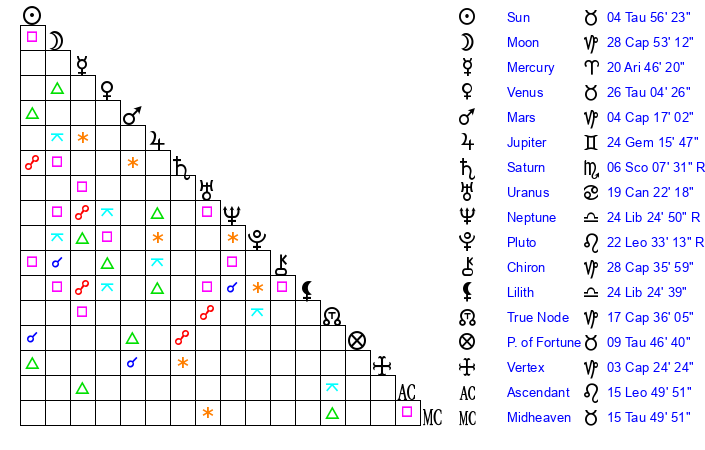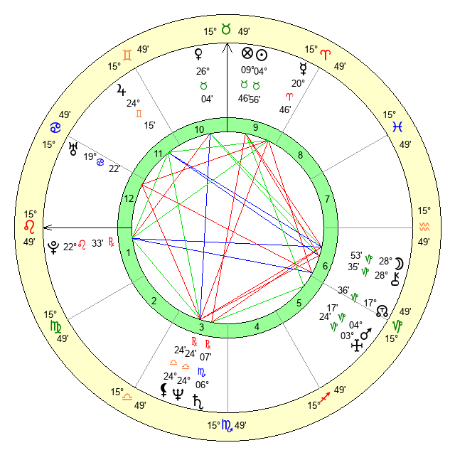 | Venus | 26 Taurus 5 | 27 Pisces 32 | 21 Leo 8 |