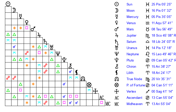 | Moon | 15 Pisces 53 | 22 Libra 44 | 9 Sagittarius 18 |