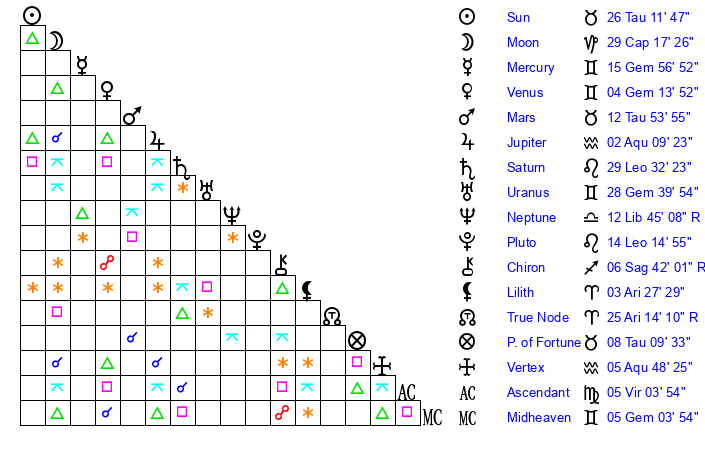 Sun | 26 Taurus 12 | 26 Taurus 48 | 8 Leo 51 |