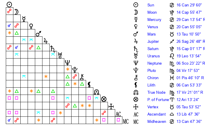 | Moon | 14 Capricorn 54 | 21 Sagittarius 46 | 5 Gemini 29 |