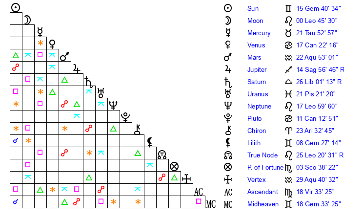 | Sun | 15 Gemini 40 | 16 Gemini 14 | 22 Virgo 33 |