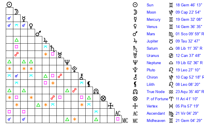 | Sun | 18 Gemini 46 | 19 Gemini 6 | 28 Leo 33 |