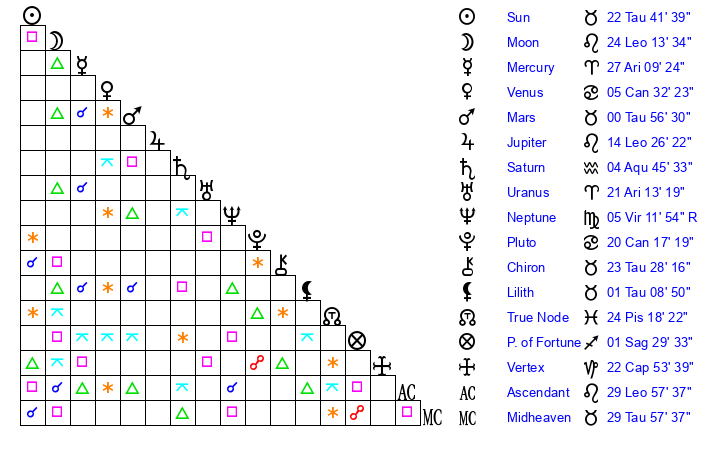 | Sun | 22 Taurus 41 | 23 Taurus 11 | 21 Leo 39 |