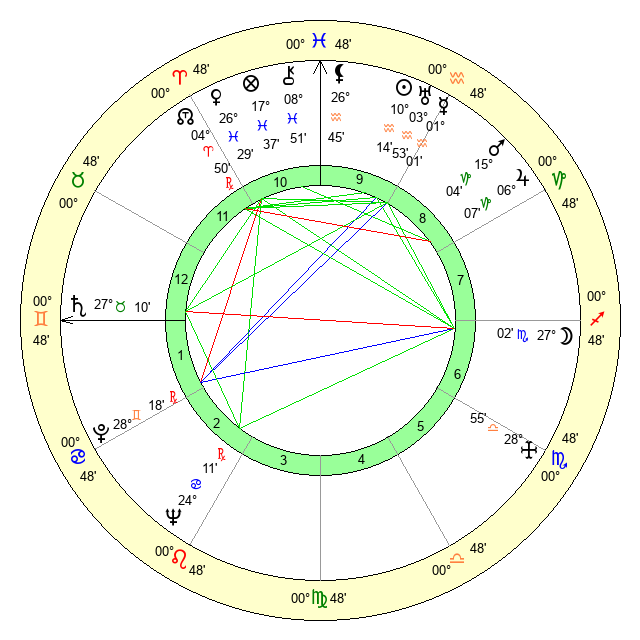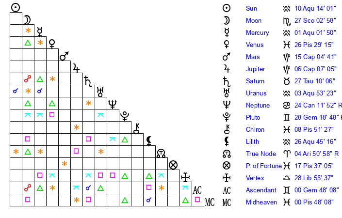 | Moon | 27 Scorpio 0 | 26 Aquarius 25 | 0 Capricorn 57 |