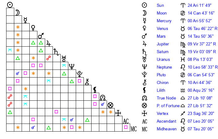 | Sun | 24 Aries 12 | 25 Aries 0 | 4 Leo 5 |