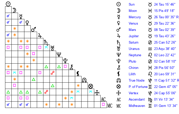 | Sun | 24 Taurus 16 | 25 Taurus 7 | 7 Virgo 41 |