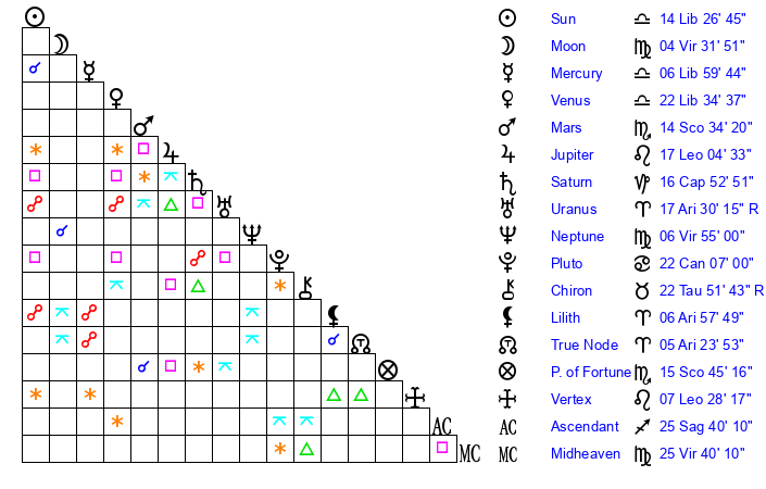 | Sun | 14 Libra 27 | 15 Libra 40 | 19 Capricorn 15 |