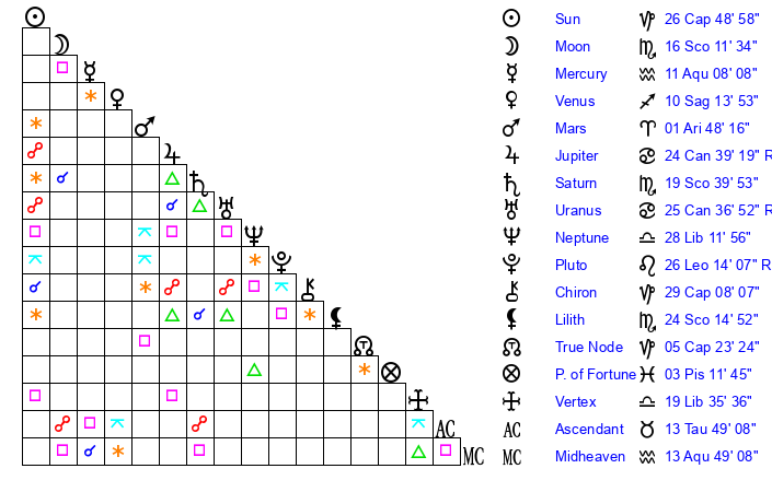 | Sun | 26 Capricorn 49 | 27 Capricorn 50 | 7 Aries 14 |
