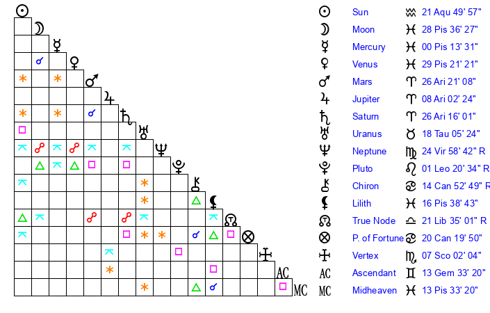 | Sun | 21 Aquarius 50 | 23 Aquarius 13 | 15 Taurus 59 |
