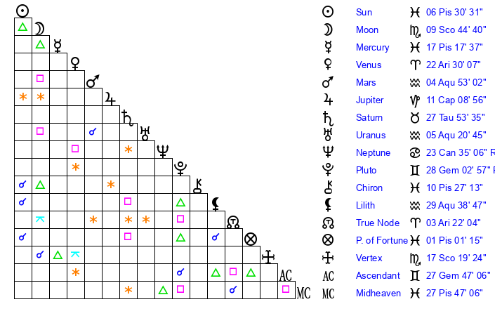 | Sun | 6 Pisces 30 | 7 Pisces 20 | 25 Gemini 51 |