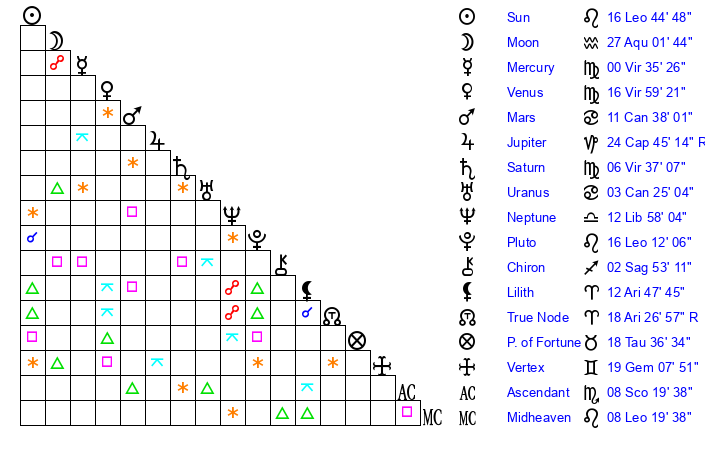 | Moon | 26 Aquarius 56 | 22 Aquarius 9 | 10 Sagittarius 14 |