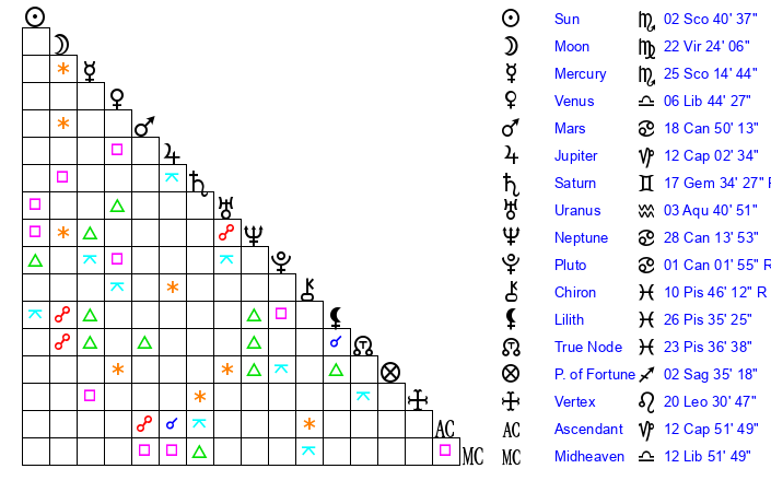 | Sun | 2 Scorpio 40 | 3 Scorpio 32 | 26 Aquarius 11 |