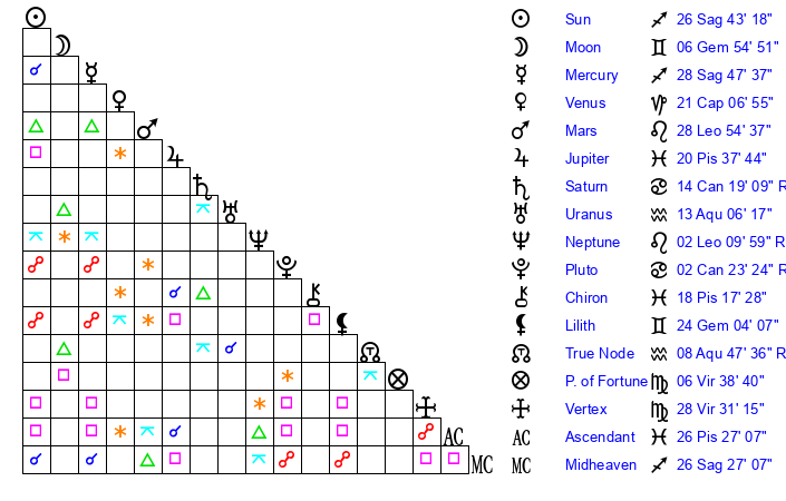 | Sun | 26 Sagittarius 43 | 28 Sagittarius 2 | 17 Aries 32 |