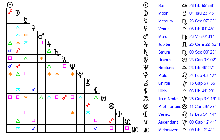 | Neptune | 23 Libra 50 | 29 Pisces 59 | 25 Libra 53 |