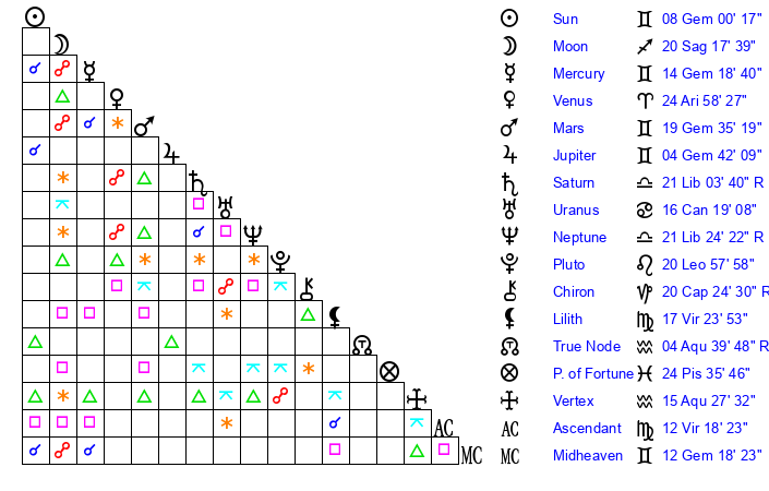 | Mercury | 14 Gemini 19 | 8 Gemini 0 | 28 Cancer 47 |