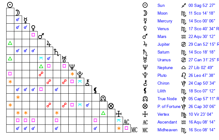 | Mercury | 14 Scorpio 0 | 24 Scorpio 6 | 29 Aquarius 31 |