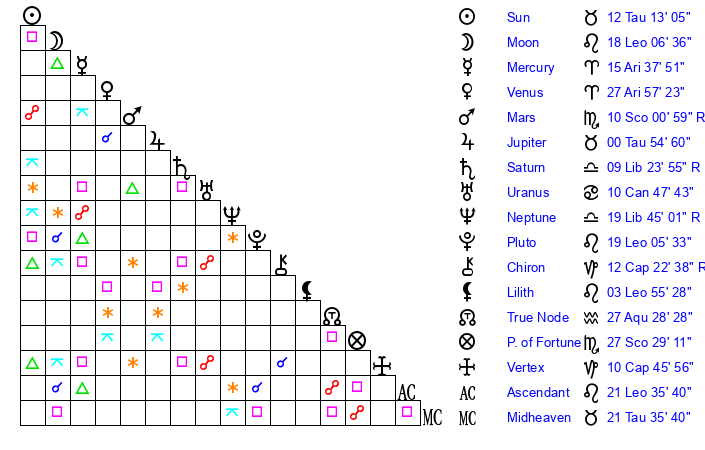 | Sun | 12 Taurus 13 | 12 Taurus 32 | 22 Cancer 9 |