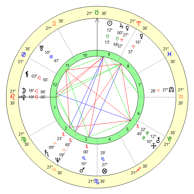 | Moon | 18 Leo 1 | 19 Cancer 42 | 29 Aries 3 |