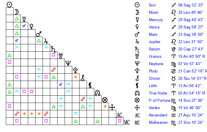 | Venus | 29 Sagittarius 59 | 1 Sagittarius 5 | 24 Aries 55 |