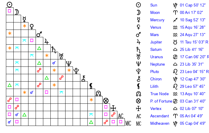 | Moon | 0 Aries 14 | 13 Aquarius 6 | 21 Scorpio 18 |