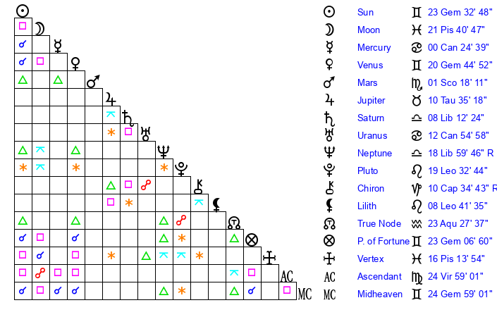 | Sun | 23 Gemini 33 | 23 Gemini 53 | 3 Virgo 22 |