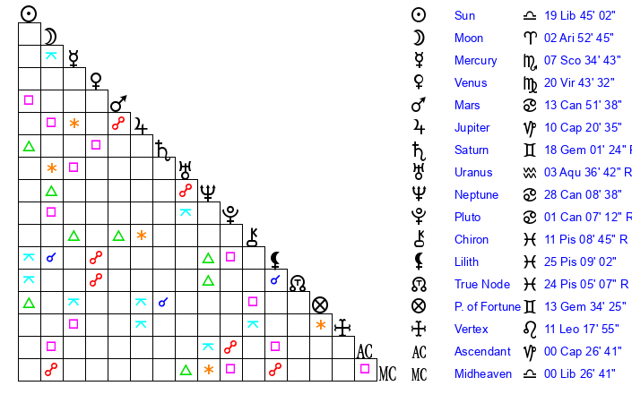 | Sun | 19 Libra 45 | 20 Libra 36 | 13 Aquarius 2 |