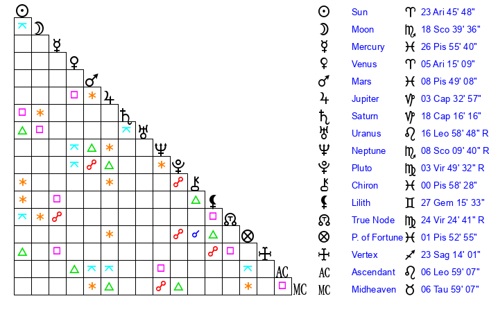 | Moon | 18 Scorpio 39 | 1 Scorpio 27 | 14 Aries 35 |