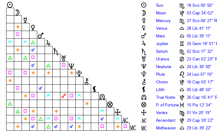 | Neptune | 24 Libra 31 | 29 Pisces 36 | 26 Libra 3 |