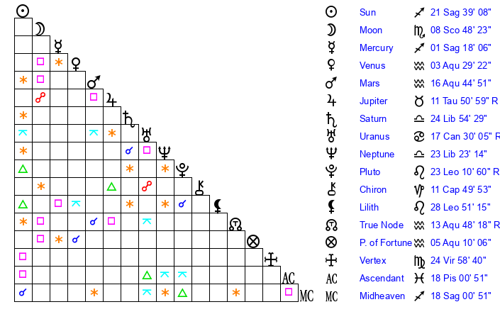 | Sun | 21 Sagittarius 39 | 21 Sagittarius 56 | 5 Pisces 48 |